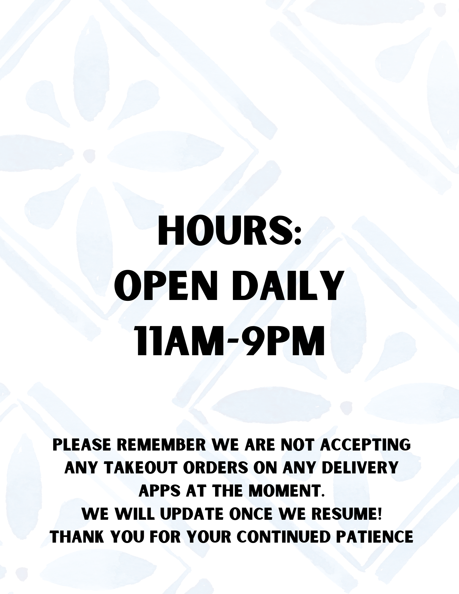 There is no takeout at this time. Thank you for your patience, love, and support through this journeyโit means the world to us.